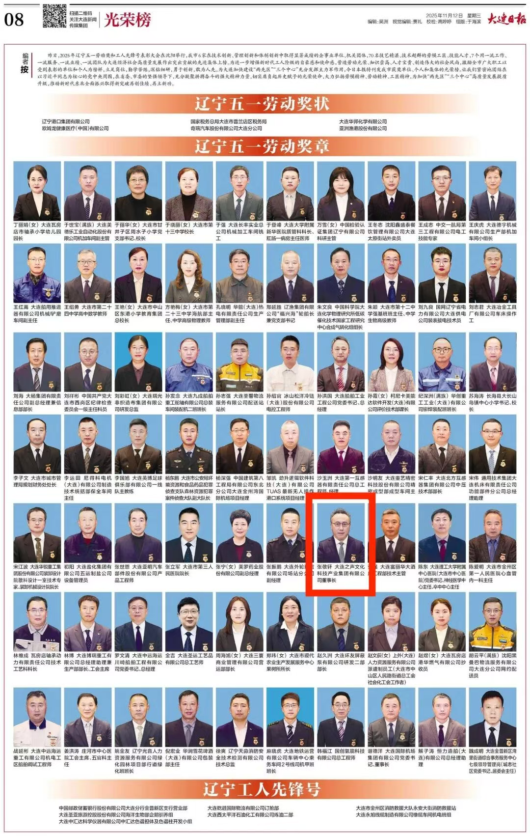 大连日报》2025年11月12日第03版报道《我市6个单位70名个人7个集体上榜》